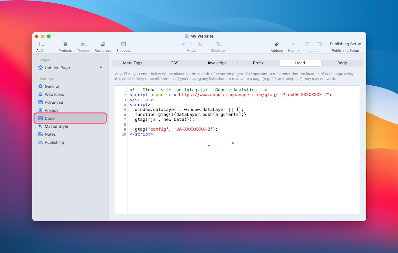 The best place to edit your website or add snippets of code like Javascript, CSS, analytics, etc is inside the RapidWeaver Project File.