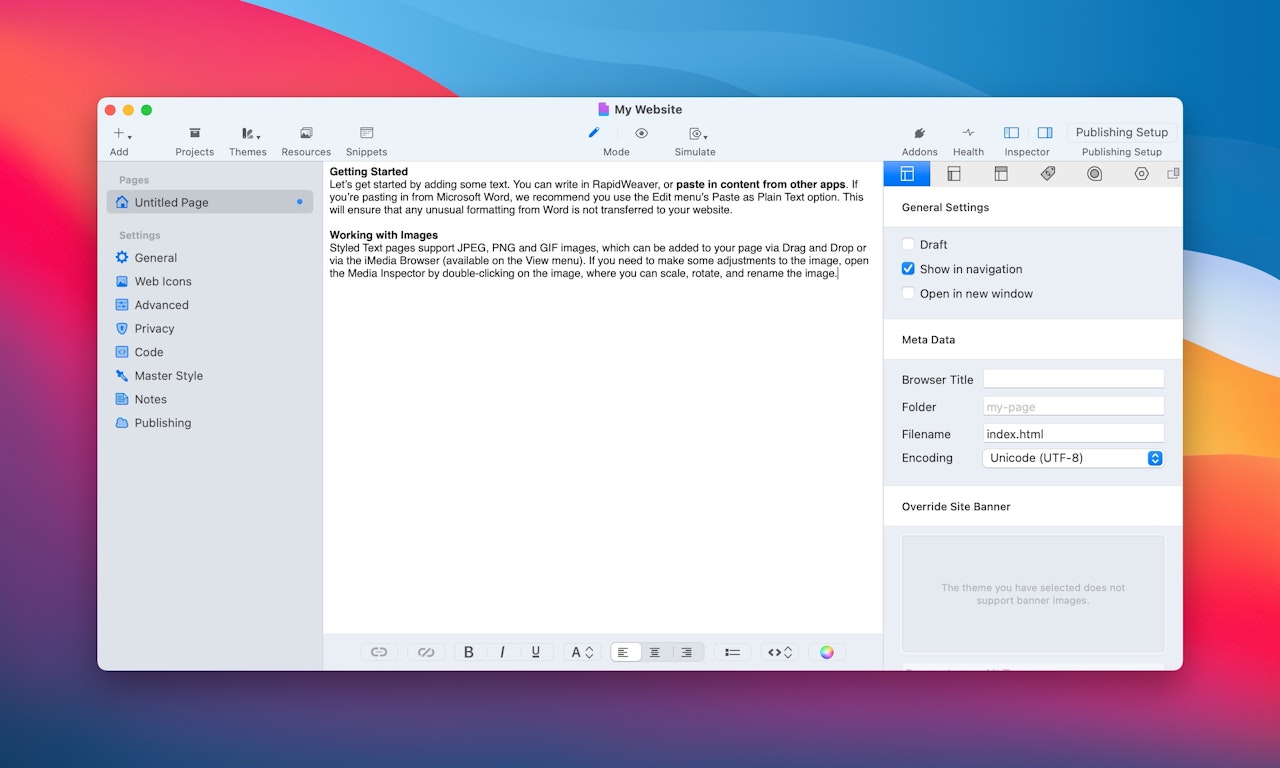 The Styled Text page is one of the most commonly-used page types in RapidWeaver. It’s flexible enough to enable you to style content with rich text formatting, but extensible enough to allow the more code-savvy among us to place in HTML if you need it (e.g. pasting in an embedded YouTube video).